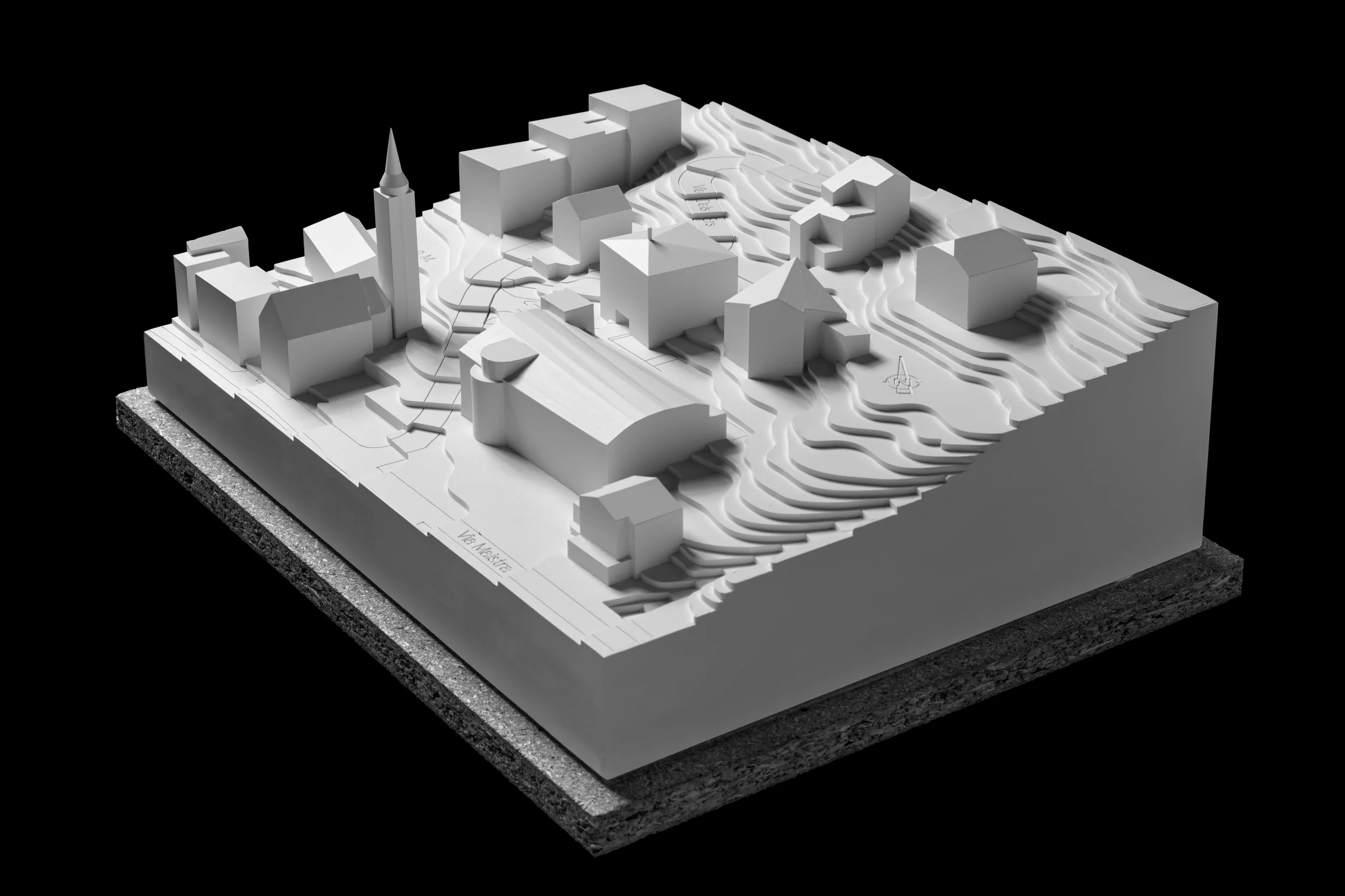 the residential building is slightly rotated and staggered in relation to the congress and cultural center Rondo, placing it modestly yet distinctly within the modern hillside residential quarter. Its western corner becomes visible from the main street between the church and the Rondo, marking its presence within the village fabric.