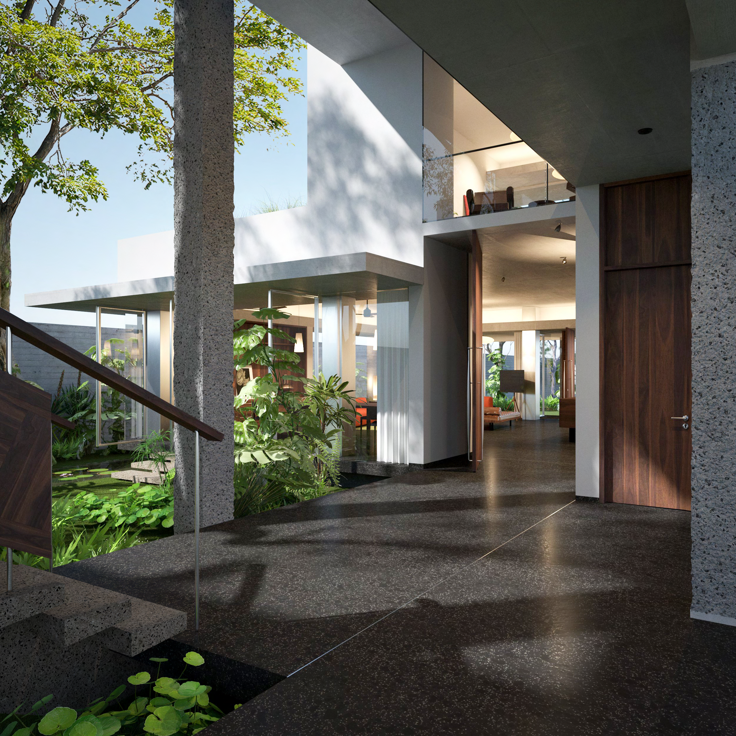 A continuous arcade weaves through the project, providing shaded circulation and evolving into an elegant bridge that frames layered views across courts, gardens, and interior spaces. Structural concrete columns become sculptural elements: externally hammered to reveal their raw mineral character, and internally wrapped in matt-polished stainless steel, reflecting light with subtle sophistication.